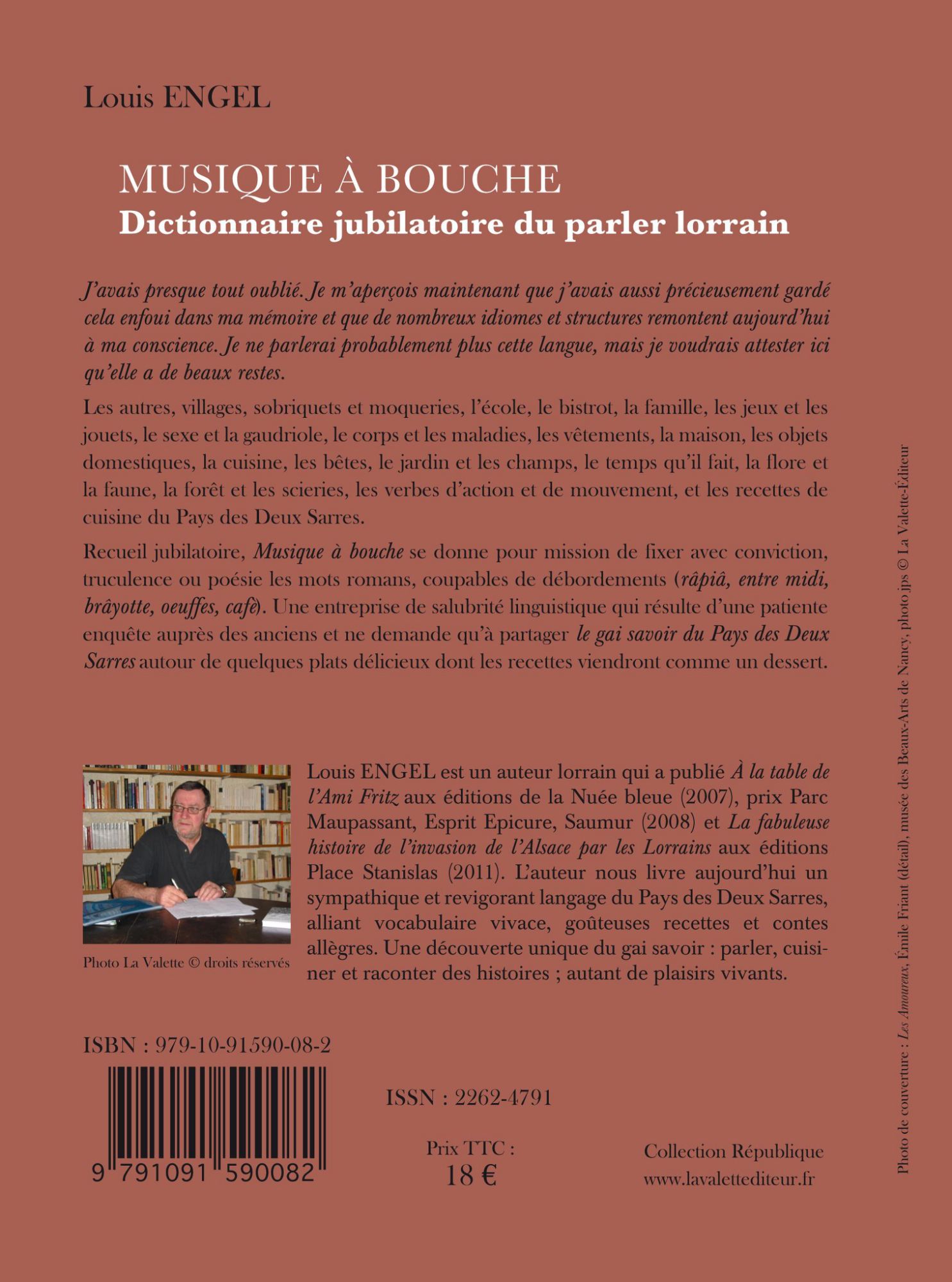 Dictionnaire jubilatoire du parler roman de Lorraine comprenant un lexique, des nouvelles en roman et en français, puis des recettes de cuisine du Pays des Deux Sarres. L'auteur tisse des liens entre le lexique , les nouvelles et les recettes. Il montre comment cette langue régionale témoigne d' une identité romane dans un environnement linguistique germanique et quel acte de résistance culturelle constitue ce parler, qui déforme, déborde, entraine vers le français.