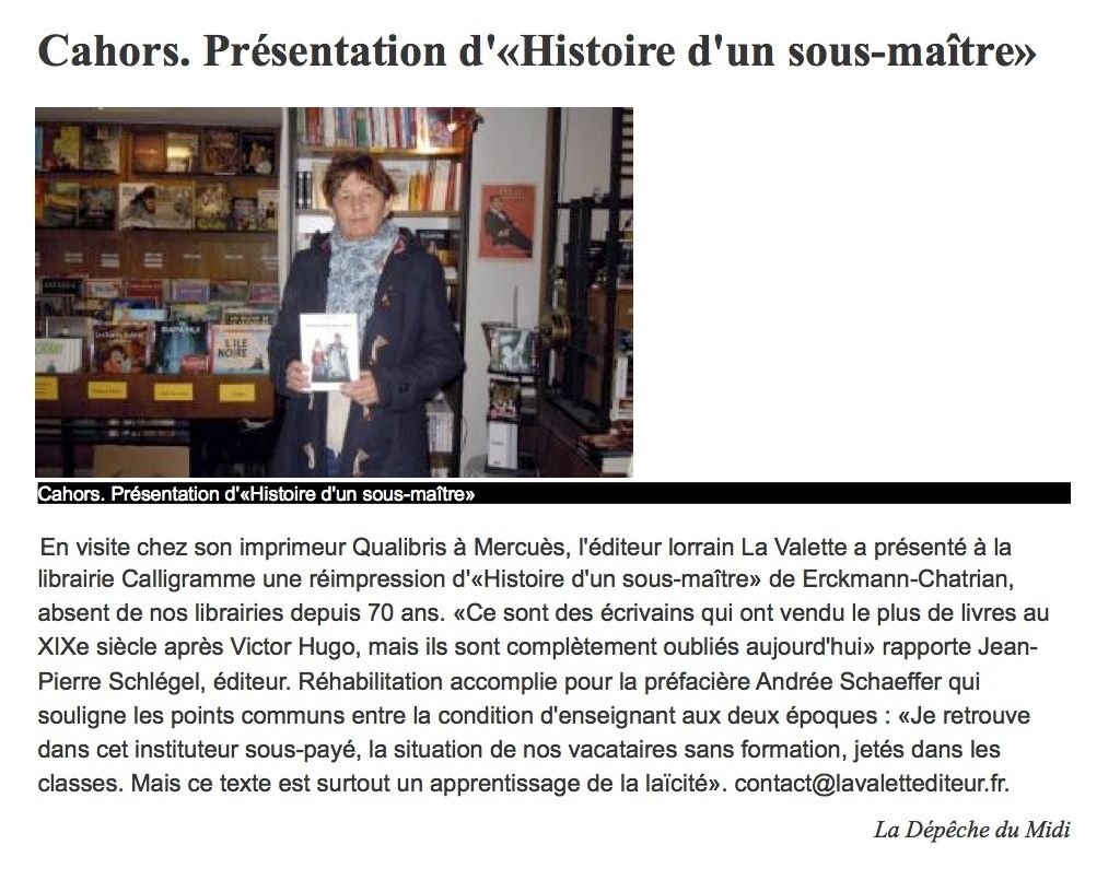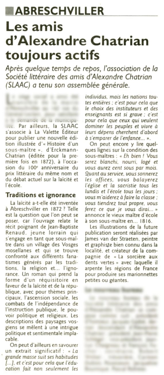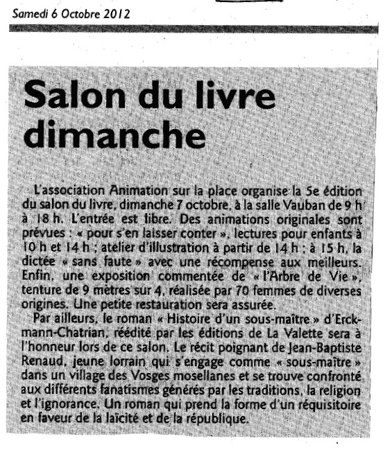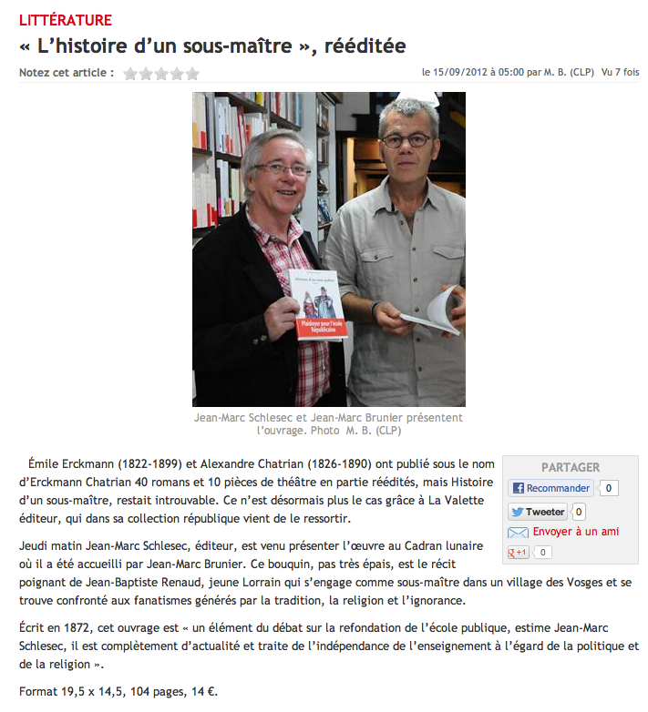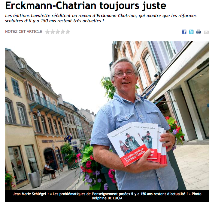 Avec la rentrée, la réforme de l’école ressurgit. Et si les éléments de débats étaient à piocher dans le passé ? C’est ce que propose la jeune maison d’édition Lavalette, implantée en Moselle à Abreschviller, sur le modèle d’Acte Sud ( implantation locale, publication tout type). Elle réédite Histoire d’un sous-maître, écrit par les Mosellans Erckmann et Chatrian en 1872, qui signaient sous un même pseudonyme « Erckmann-Chatrian ». « Le roman raconte les mésaventures d’un jeune enseignant en 1816, explique l’éditeur Jean-Marie Schlégel. Jean-Baptiste Renaud est un humaniste laïque. Il trouve une place auprès d’un maître d’Abreschviller, mais déchante vite. Il se retrouve pris dans le cloisonnement de l’enseignement religieux ». Plus qu’un débat sur la laïcité, c’est un ouvrage sur la qualité de l’enseignement. Le héros est avant tout un sous-maître compétent. « Ce n’est pas un bouffeur de curé, précise l’éditeur. Jean-Baptiste a juste une idée précise de son métier. Il ne comprend pas l’importance des dogmes conceptuels et religieux. C’est un pragmatique : l’école doit former des citoyens éclairés et parés pour affronter la vie. Une mission d’autant plus essentielle vis-à-vis des masses populaires. »