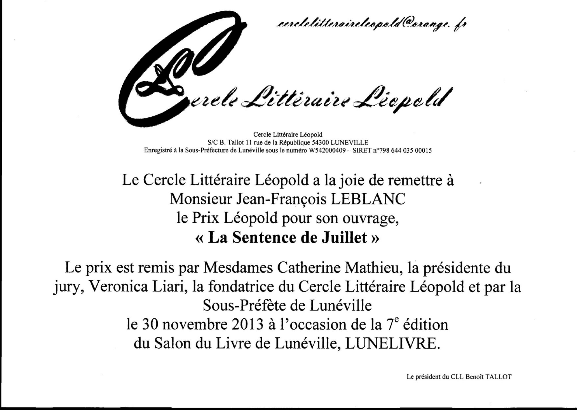 La Sentence de juillet : Le Prix Léopold 2013 a été attribué à l'unanimité du jury à: Jean-François LEBLANC pour La Sentence de Juillet